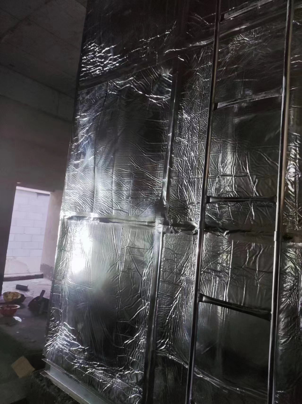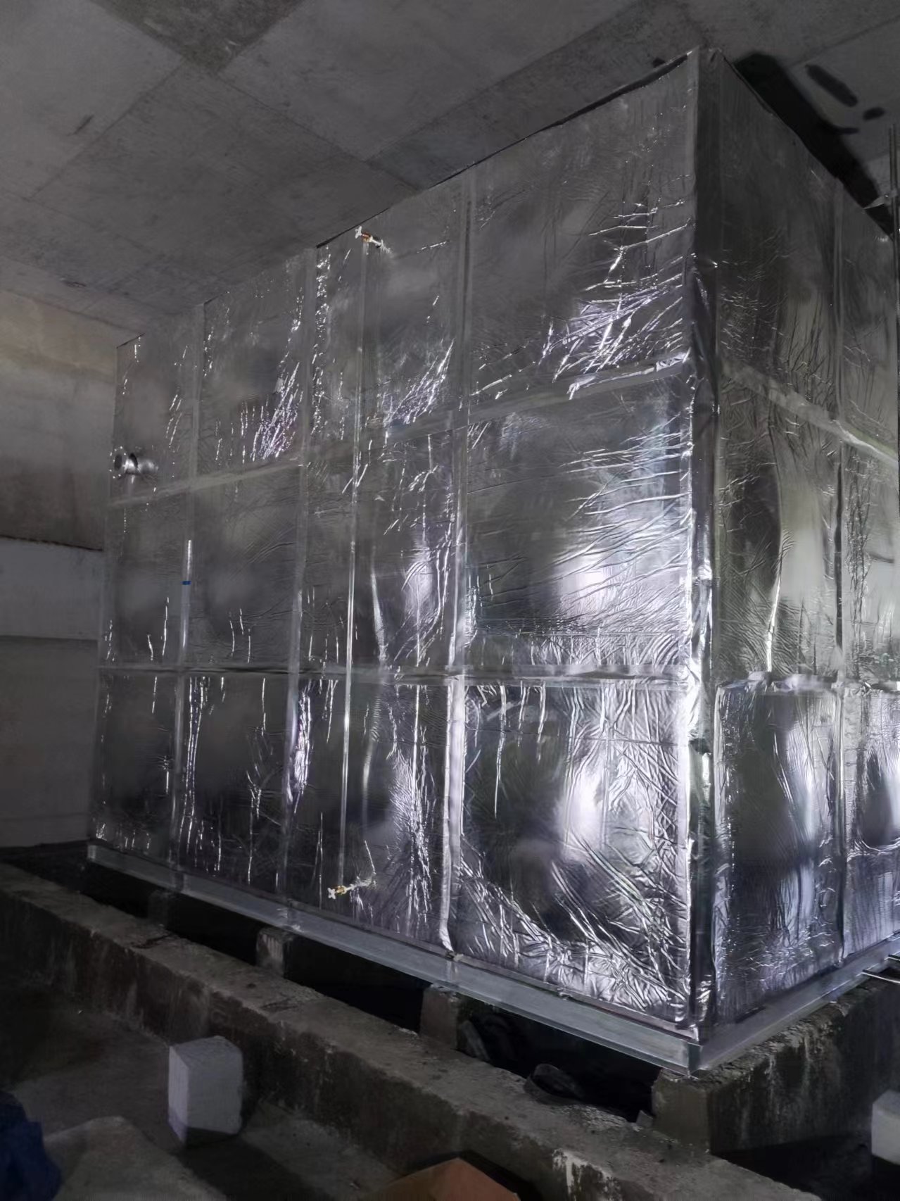 我司承接的山西省大同市中建三局職業(yè)技術學院辦公樓屋頂高位消防水箱項目,已經(jīng)安裝試水完成。此水箱為高位鍍鋅鋼板消防水箱,外表做了橡塑鋁箔布保溫層,鋁箔橡塑保溫材料為閉泡式結構,且表面平整光滑,所以外界空氣中的水汽很難滲透到材料之中,保冷保溫不必再添加隔汽層,從而獲得較佳的導熱系數(shù),它的陰濕因子大于4.5×103,使它的整體既是保溫層又是防潮層。因此適用于多種防火要求較高的場所使用。