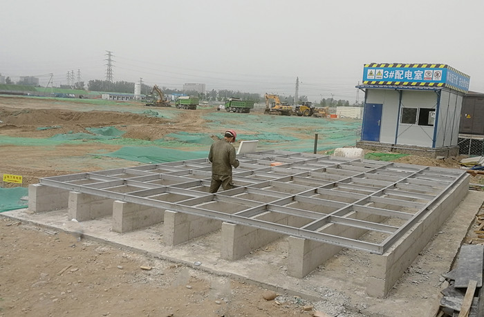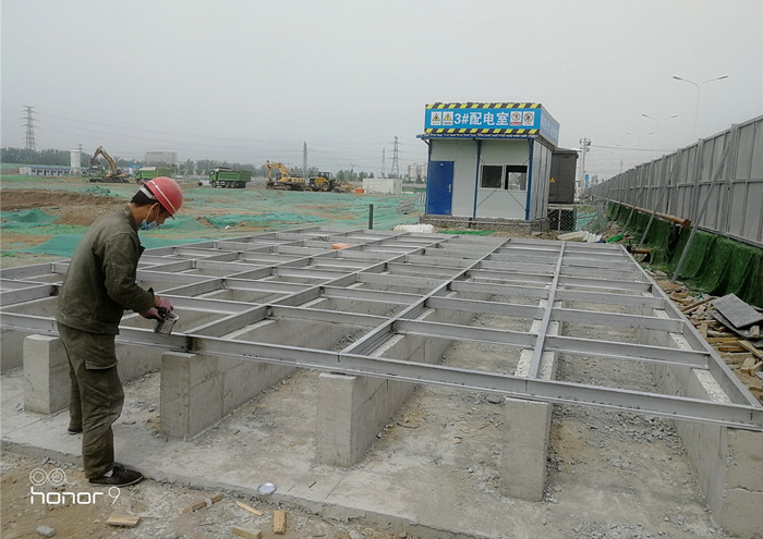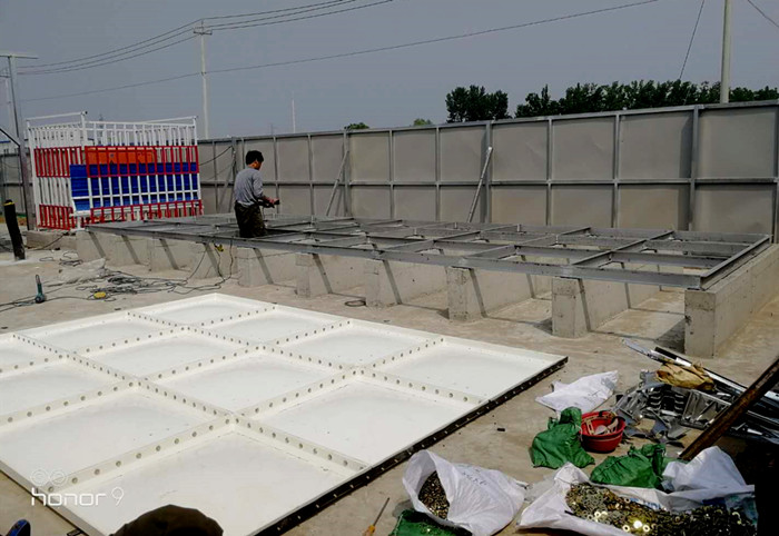玻璃鋼聚氨酯彩鋼殼保溫水箱槽鋼底座焊接完成后,把水箱底板依次擺放在槽鋼底座上